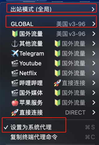 打开 ClashX 菜单中的 “设置为系统代理”,ClashX 便开始接管系统流量。