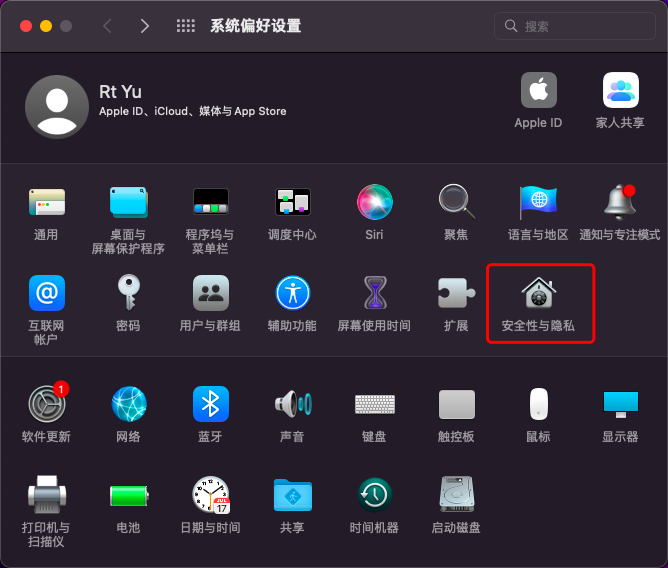 打开“系统偏好设置”,进入“安全性与隐私”。