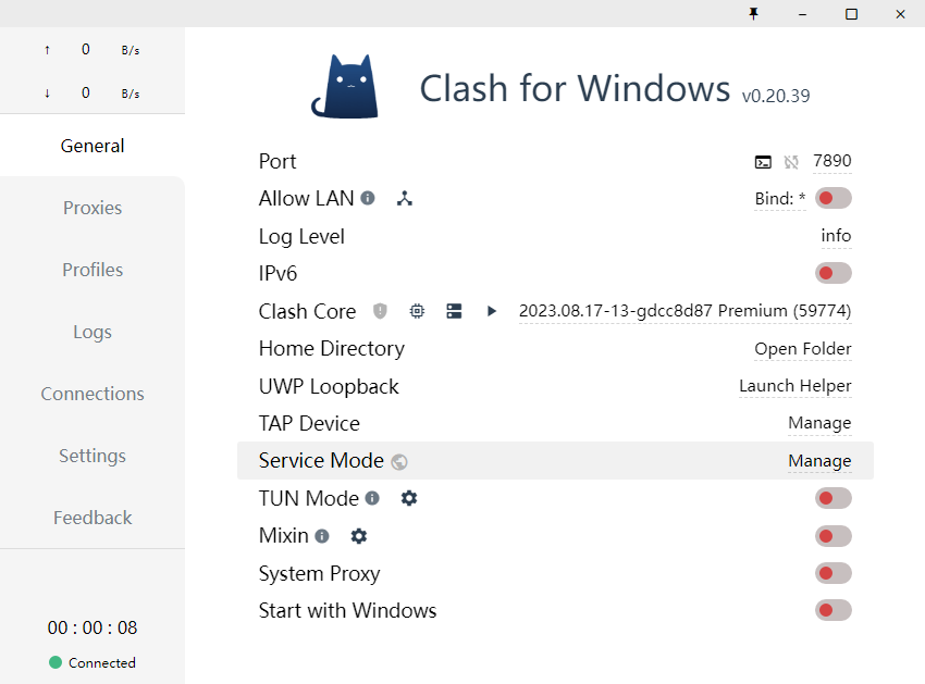 选择好您想使用的节点后,单击左侧导航栏的 “General” 后,将「System Proxy」的开关更改为绿色状态即可开始使用。此外,建议将「Start with Windows」也更改为绿色来让 Clash for Windows 在开机时自动启动。